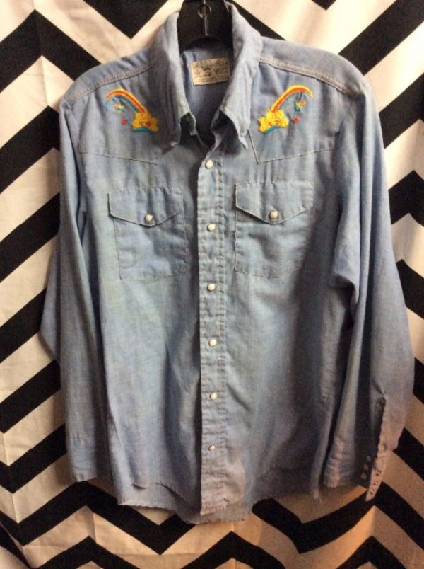 DENIIM SHIRT – CHAMBRAY – WESTERN STYLE – BUTTON-UP W/PEARL SNAPS – EMBROIDERED SUN & RAINBOW DESIGN