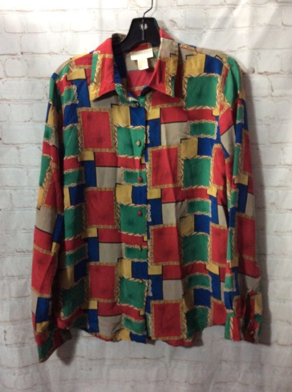 Christie & Jill shirt, silk, long sleeves, button-up, color-blocks of Baroque design with chain picture frame pattern, red/green/tan/blue, size L