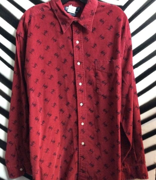 Ralph Lauren corduroy shirt, long sleeve button-up, skiers print design, red/black, size XL