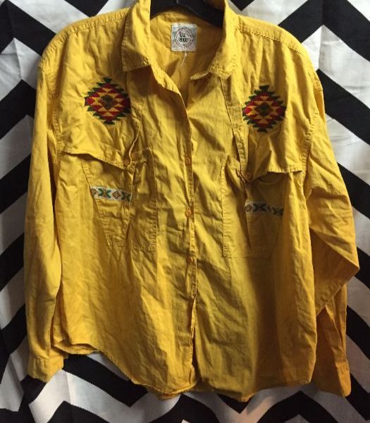Cotton shirt, long sleeve button-up, Aztec design embroidery, yellow, size M