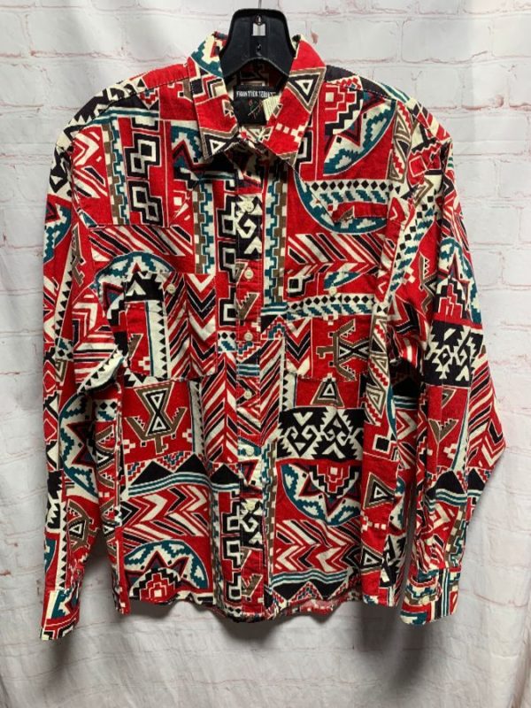Frontier Series shirt, long sleeves, button-up, abstract Native American design print, 2 button-up front pockets, red/white/brown/black, size XL
