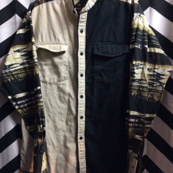 Shirt, long sleeve, button-up, contrasting halfie right and left sides in front, front pockets, funky Aztec pattern on back & sleeves, creme/black, size M