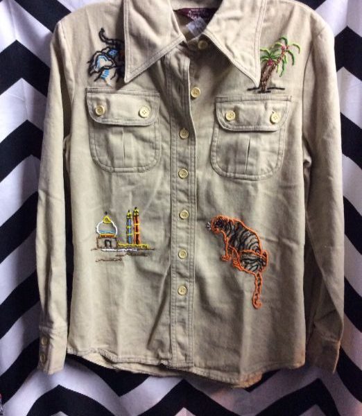 Denim shirt, long sleeve, button-up, decorative beadwork full front and back with palm trees, tiger, Taj Mahal, tan/multi-color beadwork, size M