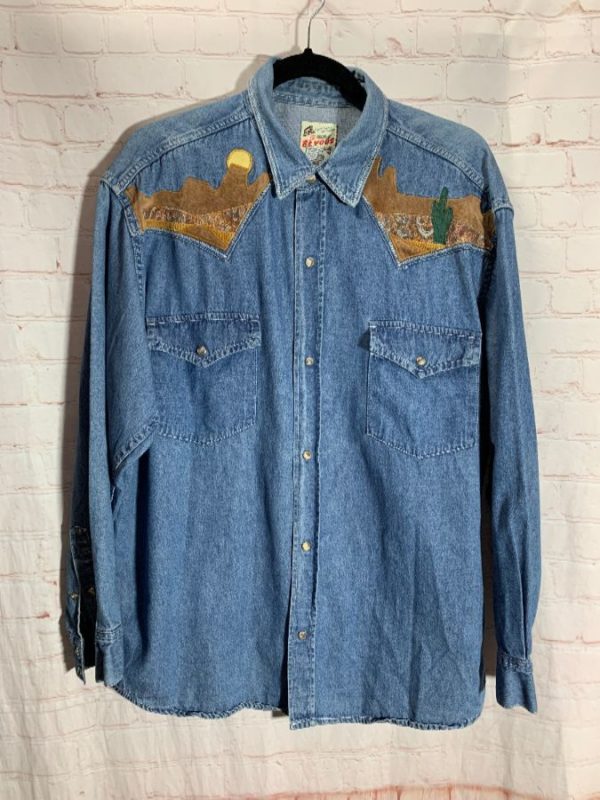Et Vous Western denim shirt, cotton, long sleeves, button-up with pearl snaps, collared, 2 snap-up front pockets, suede appliqued sun & cactus design, brown/yellow/medium blue/green, size L