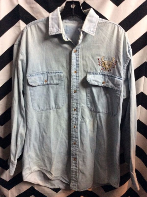 DENIM SHIRT – ACID WASHED – SCREEN PRINTED DREAM CATCHER & BUFFALO SKULL ON BACK – EMBROIDERED BUFFALO SKULL W/FEATHERS