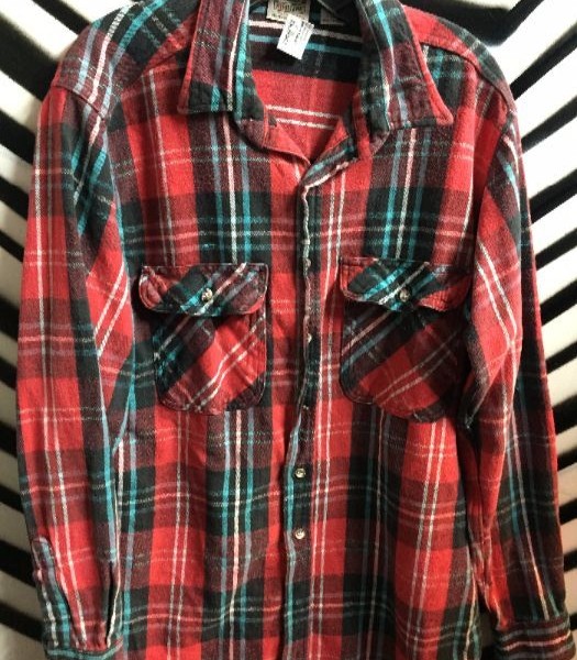 Flannel shirt, long sleeve button-up, plaid design, red/turq, size L
