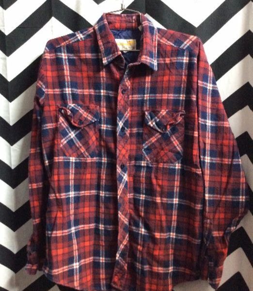 Flannel shirt, long sleeve, button-up, plaid print design, red/blue/white, size L