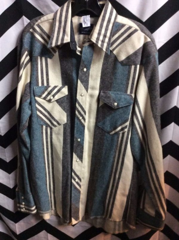 Flannel shirt, Western style long sleeves, button-up with pearl snaps, geometric vertical stripe design, white/blue/gray, size M