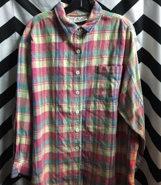Flannel shirt, long sleeve, button-up, pastel, plaid design, pink/green/blue/yellow, size XL
