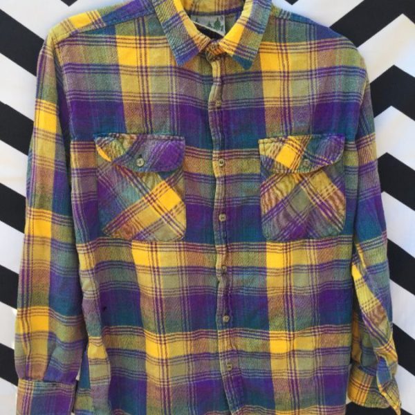 Flannel shirt, long sleeve, button-up, front pockets, bright plaid print, yellow/purple, size S small fit