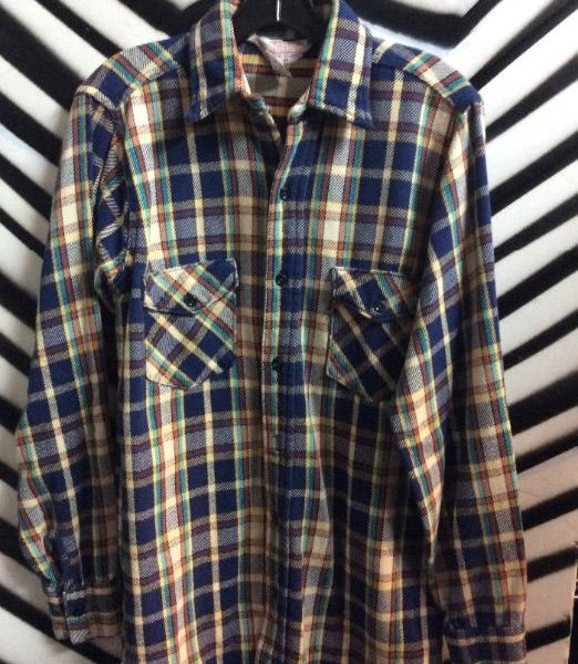 Flannel shirt, long sleeve button-up, plaid design, blue/multi-colored