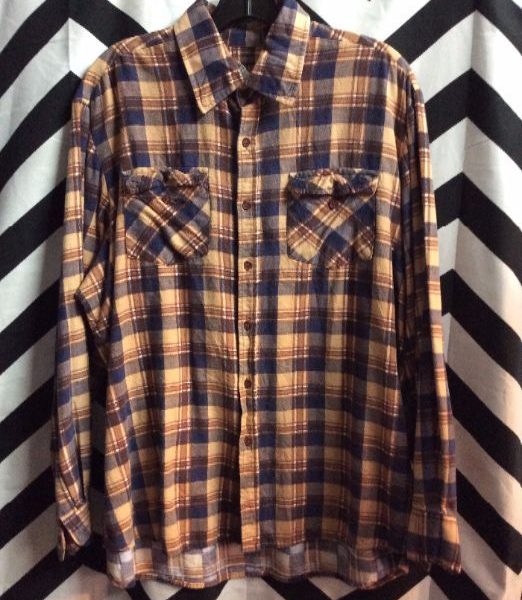 Flannel shirt, long sleeve, button-up, two front pockets, plaid design, tan/blue
