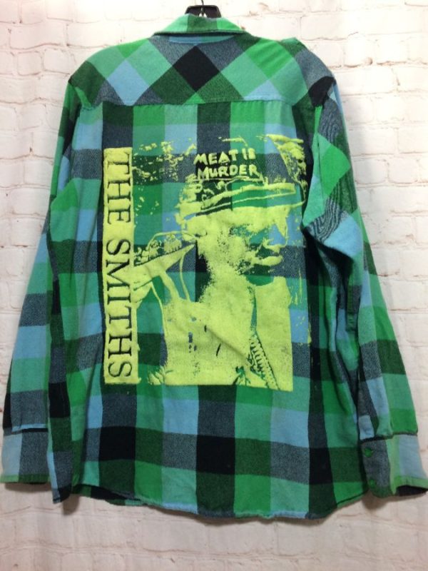 LS BD GREEN PLAID FLANNEL CUSTOM THE SMITHS MEAT IS MURDER GRAPHIC *Local Artist