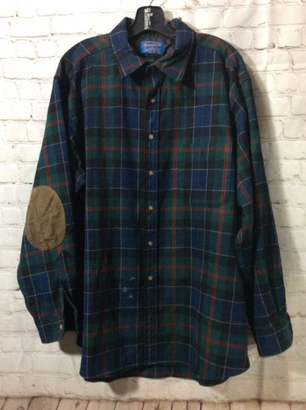 Pendleton flannel shirt, wool, long sleeve, button-up, leather elbow patches, plaid design, green/red/creme/blue, size XL as is