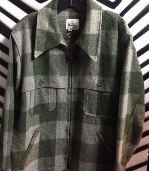 Heavy wool jacket, long sleeve button-up, olive/grey plaid, size L