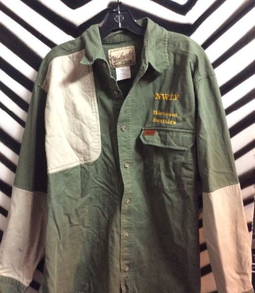 NWTF Military shirt, with creme colored patches, long sleeve button-up, embroidered, olive/creme, size M