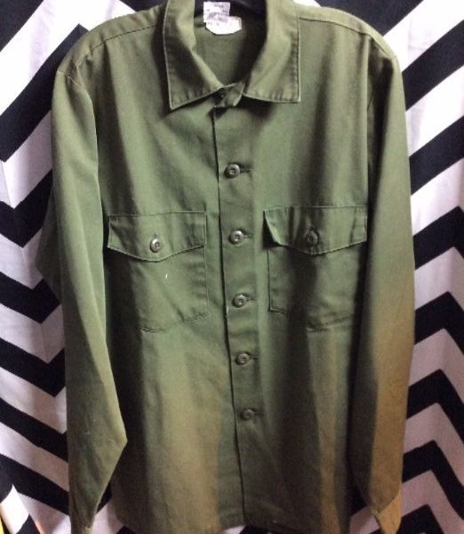 Military shirt, long sleeve, button-up, softy, olive, size L as is splattered paint stains