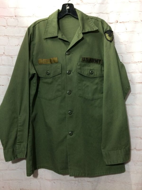Military shirt, US Army, long sleeves, button-up, Romano, left sleeve embroidered patch, olive green, size L