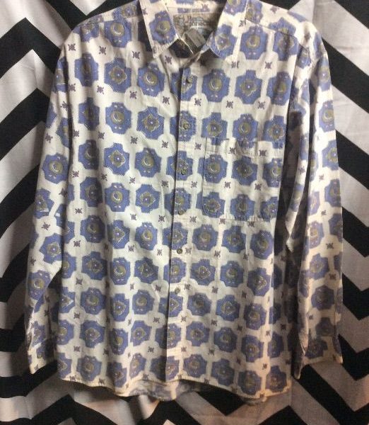 1990’s shirt, long sleeve, button-up, Moroccan print design, white/blue, size M