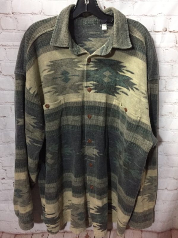 Flannel shirt, cotton, long sleeve, button-up, heavy, horizontal design with Navajo pattern, creme/medium gray/dark gray/blue gray, size XL