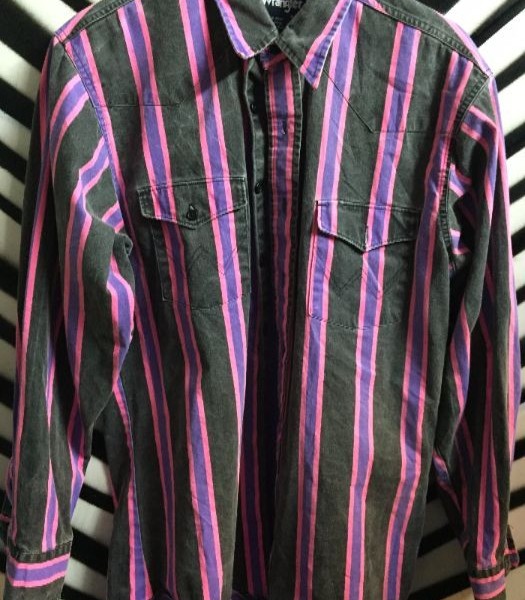 1980’s Wrangler shirt, long sleeve button-up, neon striped design, pink/black/purple, size L