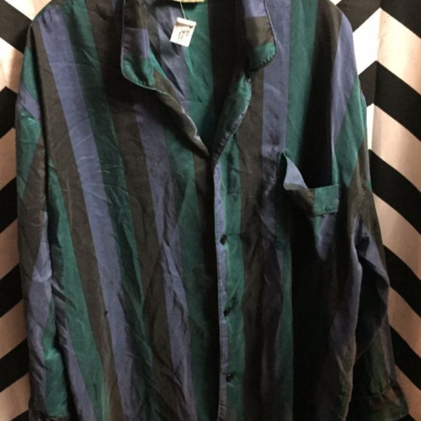 Shirt, silk, long sleeve, button-up, left front pocket, vertical stripe pattern, blue/green/purple, size XL oversized