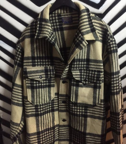 Pendleton wool shirt/jacket, long sleeve button-up, beige/black plaid, size XL