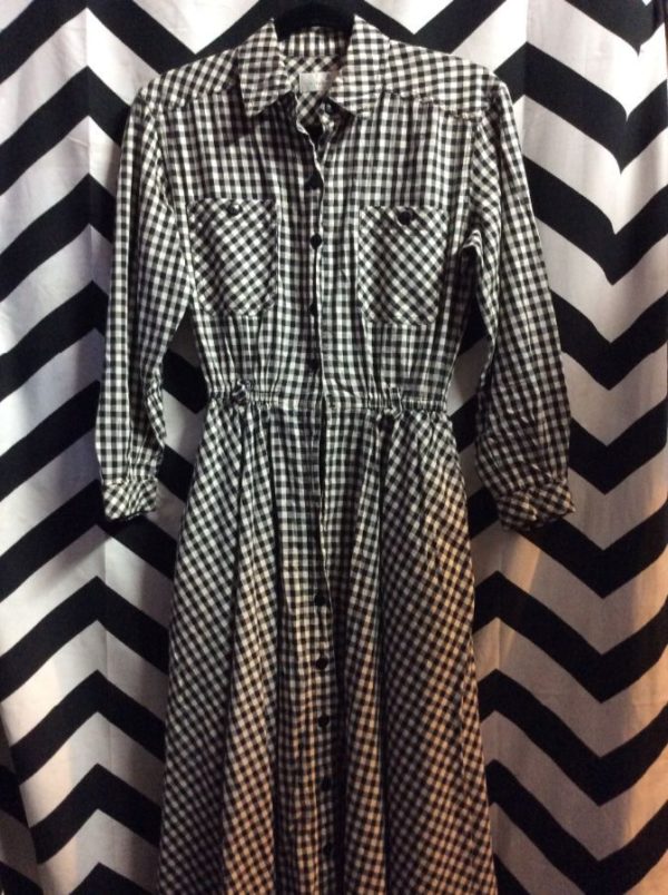 Liz Claiborne picnic dress, long sleeve, button-up, 2 front pockets, shirtwaist, buttoned cuffs, checkered dress, black/white, size 2