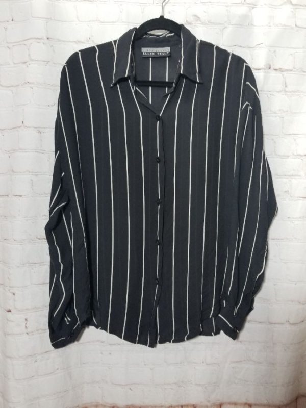 LINDA ALLARD ELLEN TRACY BLOUSE, SILK, LONG SLEEVES, BUTTON-UP, SEE-THRU, PIN-STRIPED FABRIC, BUTTON-UP CUFF, BLACK/WHITE, SIZE M