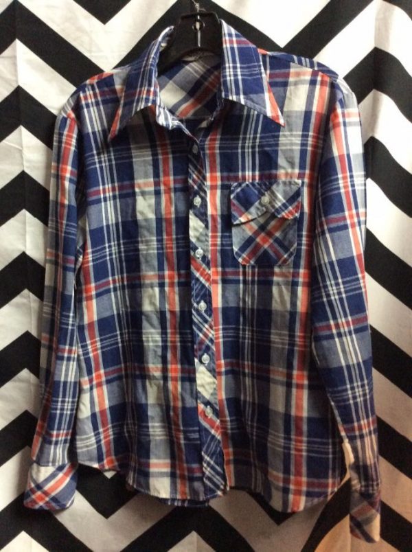 Shirt, long sleeves, button-up, one pocket, plaid design, red/white/blue, size M