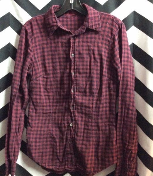 Flannel shirt, long sleeve, button-up, plaid design, burgundy/black, size S
