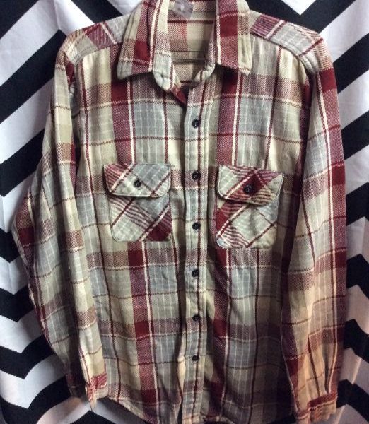 Flannel shirt, long sleeve, button-up, plaid design, creme/burgundy, size L