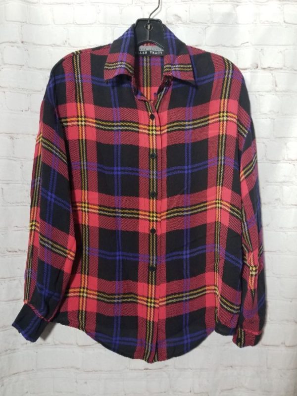Linda Allard Ellen Tracy shirt, silk, long sleeves, button-up, sheer, plaid print, red yellow blue black, size M