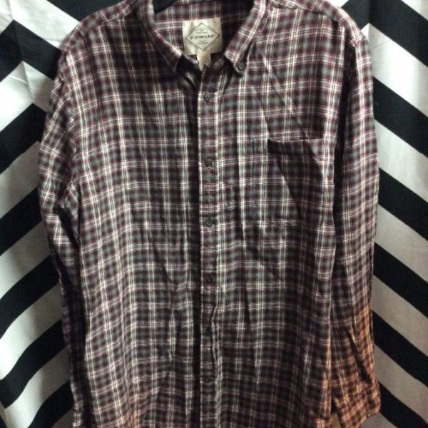 Shirt, long sleeve, button-up, single front pocket, plaid print, burgundy/green/white, size L