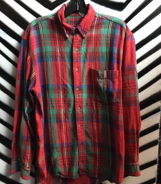 Soft flannel shirt, long sleeve button-up, plaid design, red/green/blue, size M as is has holes