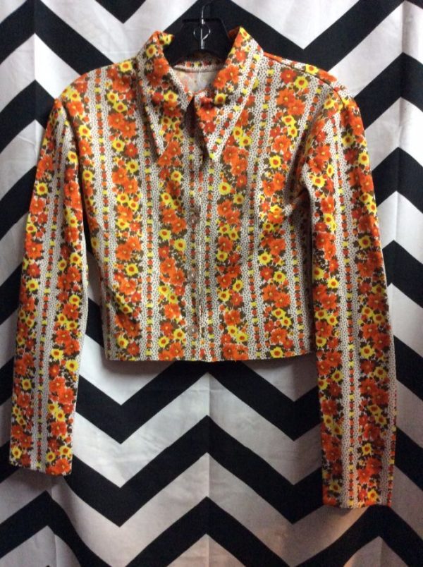 1960-1970’s top, polyester, long sleeves, button-up, floral printed design, white/brown/orange, size XS