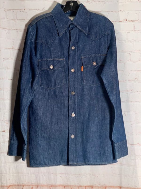 Levi’s raw denim shirt, cotton, Western style, orange tab, long sleeves, button-up, 2 button-up front pockets, medium blue, size S