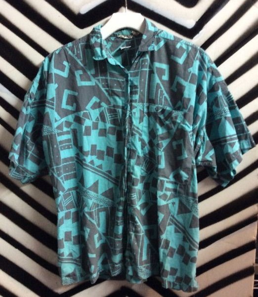 Saved by the bell shirt, short sleeve button up, turquoise/grey