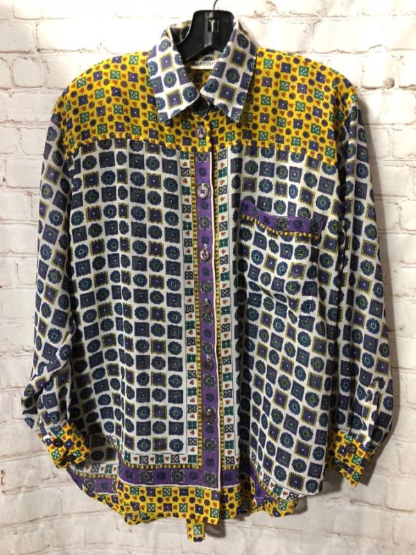 Martinique blouse, long sleeve, button-up, sheer, square print pattern in color-block design, front pocket, purple/white/yellow/green/blue, size M