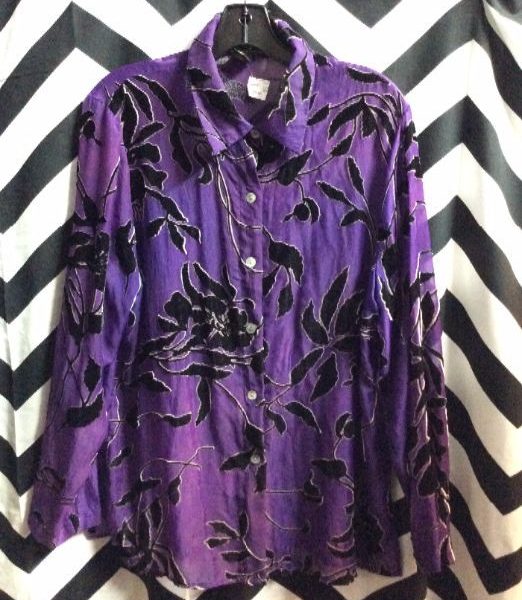 Blouse, flocked velvet, long sleeve, button-up, sheer, purple/black, size L
