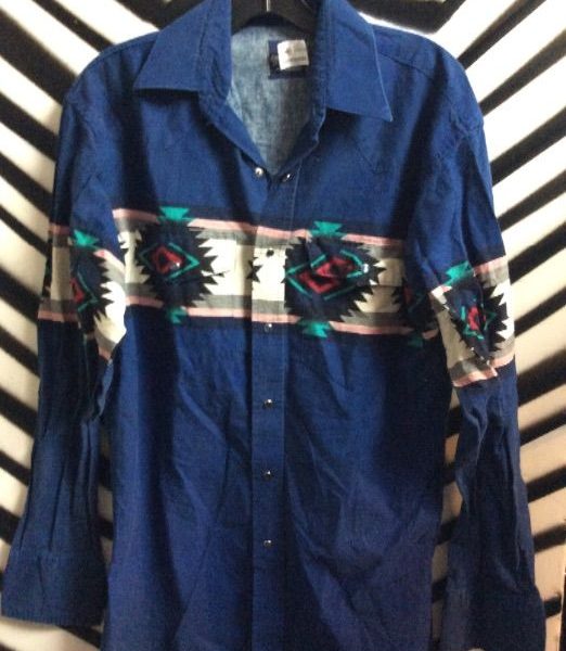 Wrangler shirt, long sleeve button-up, Aztec print design strip, blue/multi-colored, size M