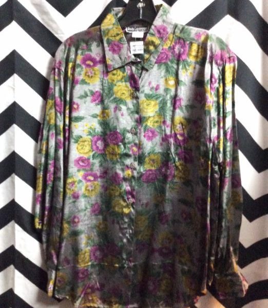 SHIRT – LONG SLEEVES – BUTTON-UP – FLORAL ROSE PRINT ON METALLIC BACKGROUND
