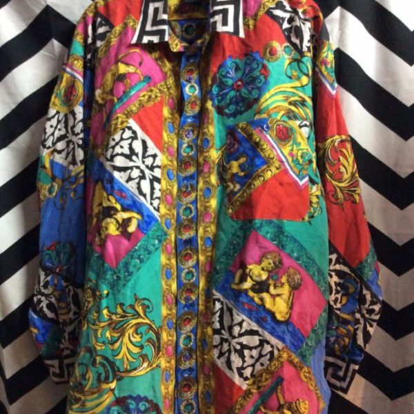 Shirt, long sleeve, button-up, silk, Baroque style, lion & gem stone design, multi, size M