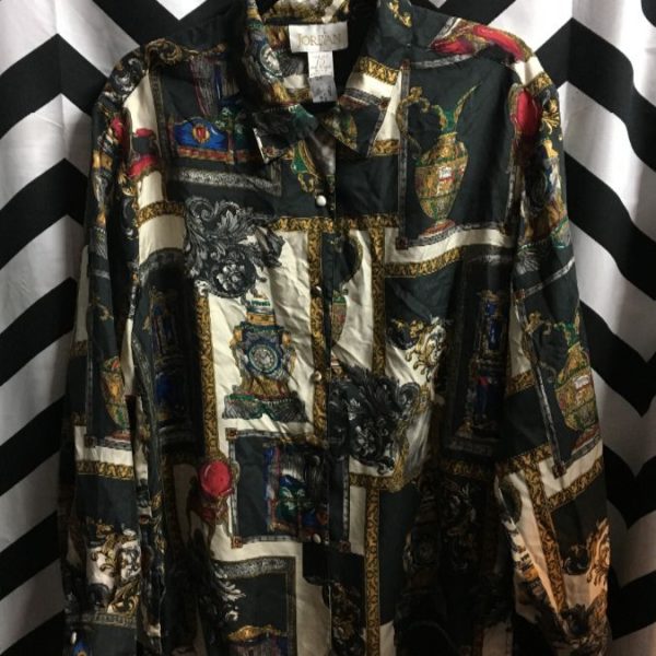 Blouse, silk, long sleeve, button-up, ornate printed design, creme/black/multi, size L
