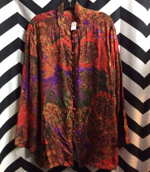 Blouse/shirt, silk, long sleeve, button-up, paisley print design, red/purple, oversized as is