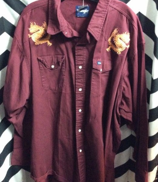 WRANGLER WESTERN SHIRT, LONG SLEEVE, BUTTON-UP WITH PEARL SNAPS, EMBROIDERED DRAGON DESIGN ABOVE BOTH POCKETS, MAROON, SIZE XXL