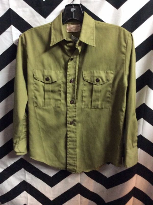 Boy Scouts shirt, long sleeves, button-up, flag patch right shoulder, olive green