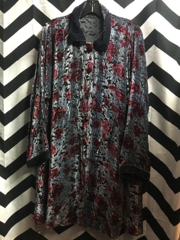 Dress, velvet, long sleeve, button-up, longer cut tunic, floral flocked burn-out design, burgundy/blue/black, size XL
