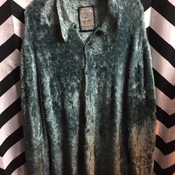 Cardigan shirt, long sleeve, button-up, fuzzy pile velour, collared, hand made, aqua green/blue, size XL