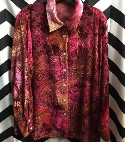 Blouse, velvet, long sleeve, button-up, burnout design, crazy pattern, pink/orange, size L